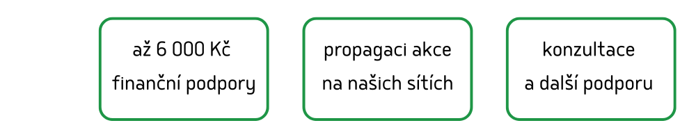 - finanční podporu ve výši až 6 000 Kč na nákup materiálu, zajištění občerstvení, dopravu nebo další náklady. V individuálních případech se můžeme domluvit i na navýšení podpory.