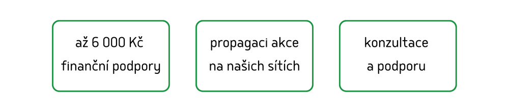 - finanční podporu ve výši až 6 000 Kč na nákup materiálu, zajištění občerstvení, dopravu nebo další náklady. V individuálních případech se můžeme domluvit i na navýšení podpory.
